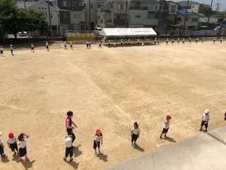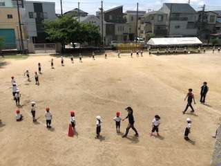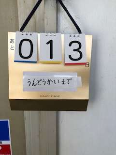 運動会まであと2週間となりました。校長室前にあと○日のカウンターをかけています。運動場では、1、2年生が練習に励んでいます。