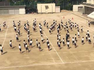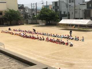 運動会の練習の様子です。5、6年生と3、4年生です。暑いので熱中症に気をつけながら進めています。