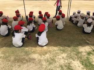 練習の合間にテントの中で暑さを防いで休憩しています。熱中症対策のため、水分を補給しました。