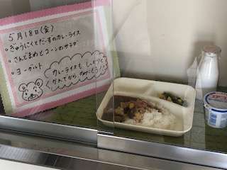 今日の献立は、児童に一番人気のあるカレーライスです。給食を調理されている業者の方が児童に食缶や牛乳かごを手渡しています。