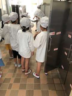 給食室(調理する場所ではなく、児童が給食の牛乳やおかずなどを取る場所です)様子です。