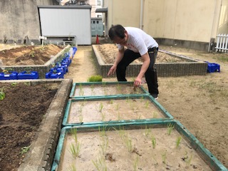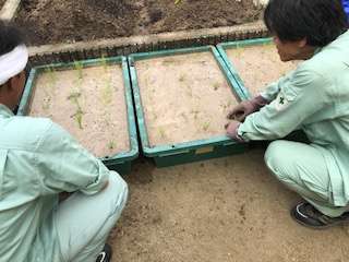 先日、5年生が植えたコシヒカリの苗の残りを管理作業員と校長が大型ケースに植えました。子どもたちにお米の育ち方を観察させていこうと考えています。