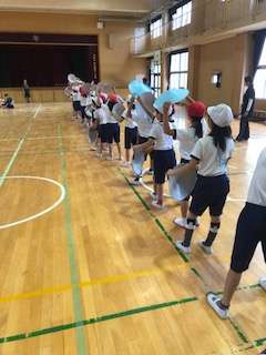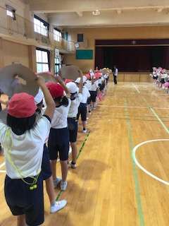 今日は雨のため、体育の授業で運動会の練習をしています。