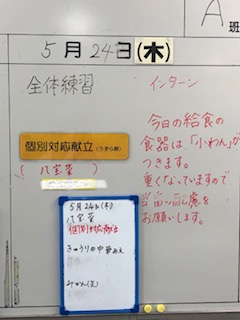 今日の給食は、うずら卵についての個別対応献立となっています。職員室の前にあるホワイトボードに明示して教職員が情報を共有できるようにしています。対応が必要な学級名も貼っています。(写真では見えないように加工しています。)