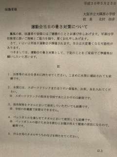 保護者の皆様におかれましては、25日にお配りしました「運動会当日の暑さ対策について」のお手紙をご覧になり、暑さ対策をお願いいたします。
