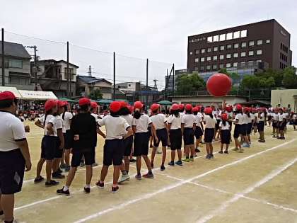 午後の部です。応援合戦、全学年による「大玉おくり」、1年生「よーいどん!」です。