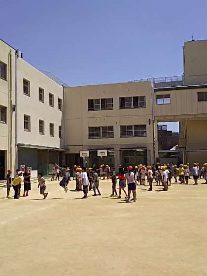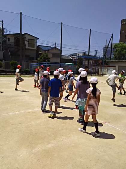 二時間目のあとの休み時間に学校のみんなで長縄の8の字をしています。
