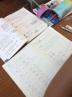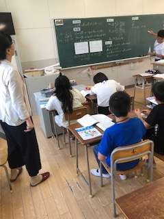 算数の授業は、分数のわり算です。習熟度別で授業を行っています。今日は教育センターの方も参観されています。