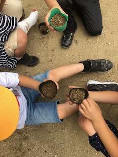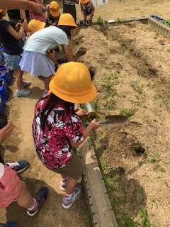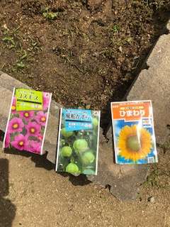 1年生がコスモスとひまわりと風船かずらの種をポットに一人ずつ植えました。毎日水をやり、観察して育てていきます。