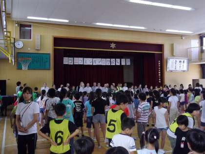 写真は、はじめの会で敬老会の方の話を聞いている様子です。