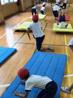 3年生は体育館全体を使ってマットやとび箱などを行なっています。