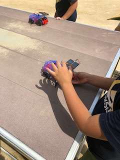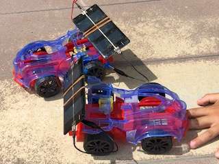 理科で光電池の学習をしています。太陽の光でクルマを走らせています。