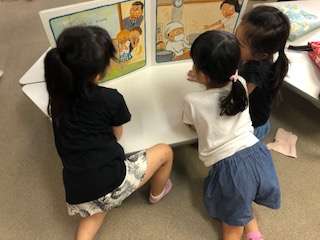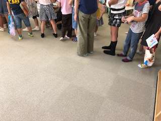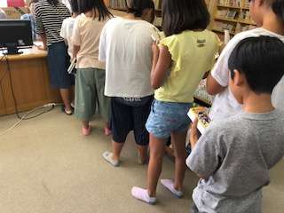 雨のため、休み時間にたくさんの子どもたちが図書館に来ています。地域の方が開館されて、貸し出しの手続きもしてくださっています。本を借りる子どもたちが列をつくっています。