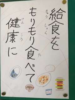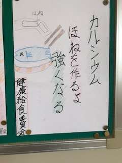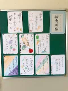 給食室の横の掲示板に健康給食委員会が作った給食川柳がはられています。
