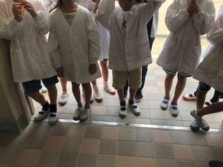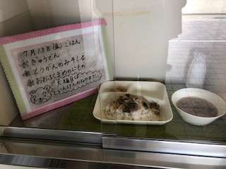 給食室には今日の献立が展示されています。給食当番の子どもたちは、入り口でいただきますのあいさつをしてから中に入ります。