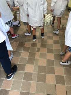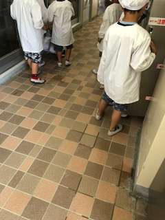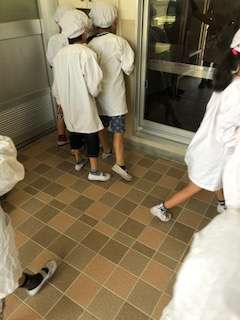 給食室に入ると給食当番の子どもたちは、まず、今日の献立見本を見て確認します。
