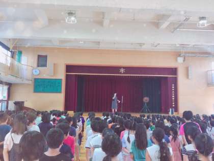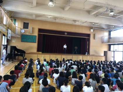 1学期の終業式を講堂で行いました。校長の話、生活指導の話の後、全員で校歌を歌いました。交通安全や熱中症予防の話などを子どもたちはしっかりと聞いていました。