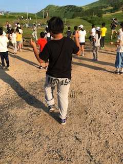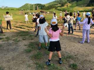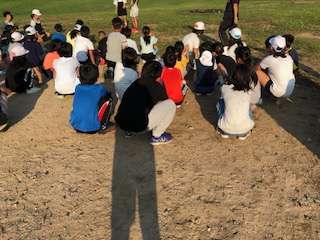 6時半から宿舎前で朝会を行いました。エビカニクスの体操で体を起こしました。