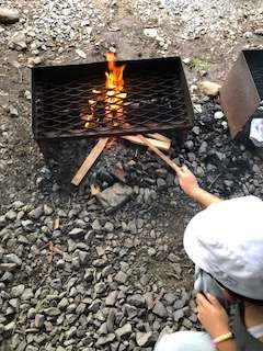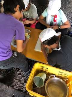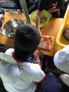 飯ごうでご飯をたいて、鍋でカレーを作ります。火おこしもなかなか難しいようです。