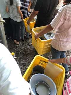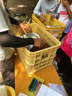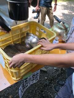 使った飯ごうや鍋などを返却する時に、汚れが取れているかを宿舎の方がチェックされています。次に使う学校のために細かく汚れを見ておられます。