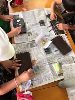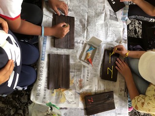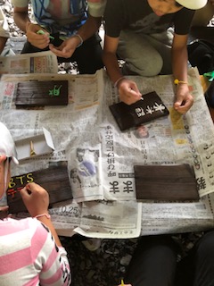 昨日みがいた焼き板に絵や文字をかいています。部屋のドアや玄関に飾るという子どもが多いようです。すてきなおみやげができました。