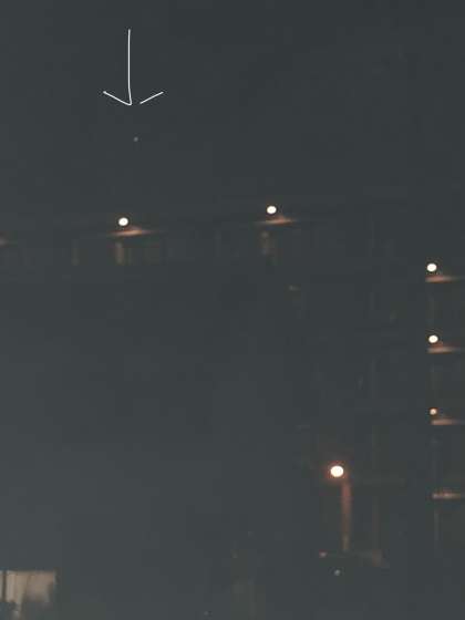 今日は、火星大接近です。今日、7月31日の夜8時45分頃の南の空に見えている火星です(写真の矢印)6階建のマンションの上に見えています。一晩中見えます。家の外で観察する時には大人の方といっしょにご覧ください。