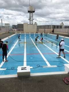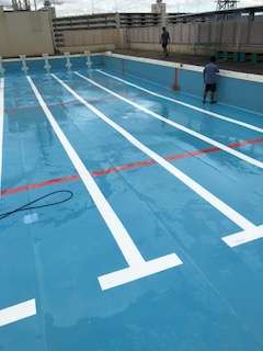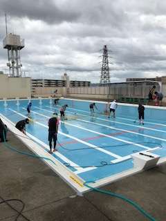 教職員でプールの掃除をして、二学期のプール水泳の授業に備えています。
