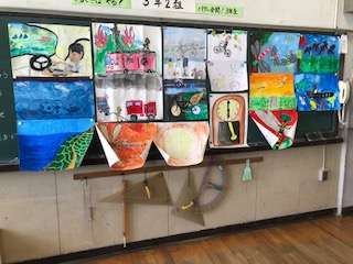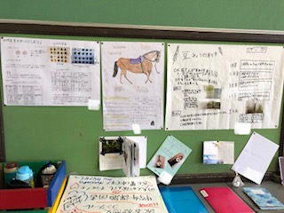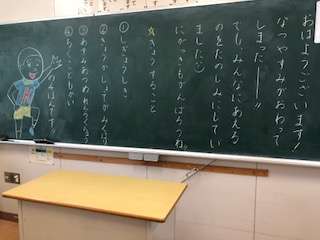 教室には、児童を迎える言葉が書かれていたり、夏休みの宿題の作品が掲示されていたりしています。