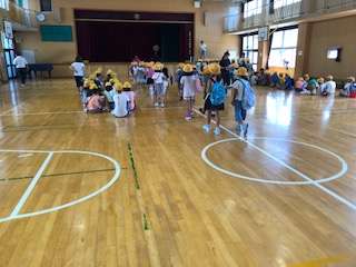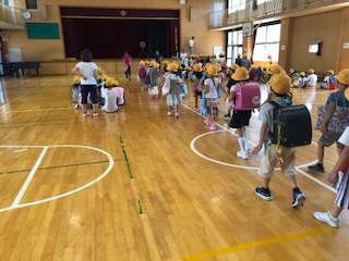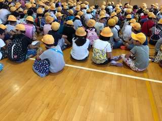 台風を想定した避難訓練を行い、集団下校のために体育館に集合しました。
