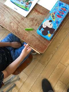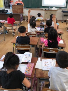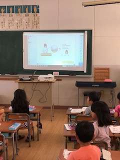 1年生の算数の授業です。鉛筆を使って机の長さを測ることを学習しています。