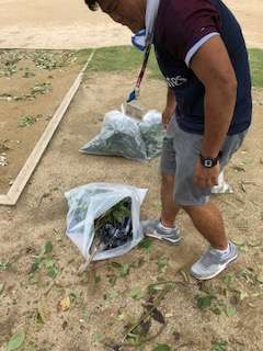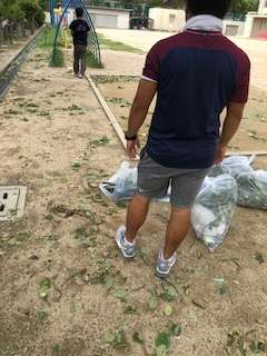 教職員も体育館や運動場の清掃を行いました。樹木の枝が多く見られました。