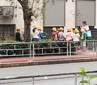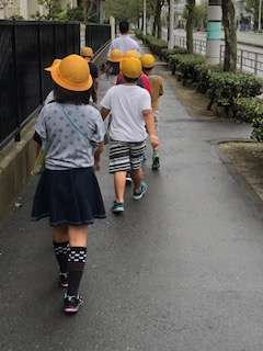 3年生が地域にあるコンビニエンスストアに見学に行きました。これから行くグループと見学を終えて帰るグループの様子です。