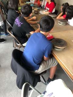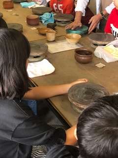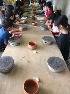 陶芸体験をします。はじめに作りかたの説明を聞きます。