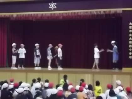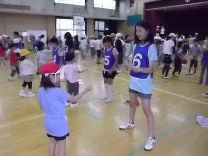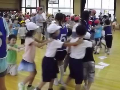 今日の児童集会はじゃんけんリレーです。班長とじゃんけんをして、もし負けたら全員で班長の周りをくるっと回らないといけません。