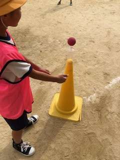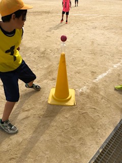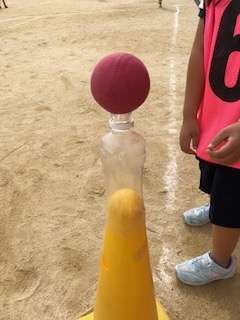 4年生はハンドベースボールに取り組んでいます。コーンの上にペットボトルをかぶせてボールを置くなど工夫されています。