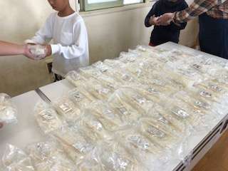 防災学習の後に炊き出しのご飯を受け取ります。非常食も食べるのも防災体験として大切になります。