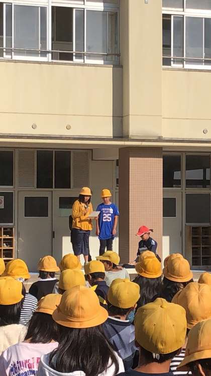 久しぶりの全校朝会です。昨年の児童絵画展の表彰の後に、校長から明日の創立記念日についての話がありました。その後、図書委員会の話(おはなししりとり)、後期代表委員会の自己紹介と続きました。
