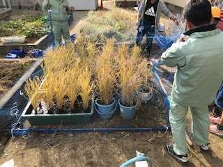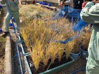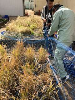 5年生がバケツで育ててきた稲が実りました。まず、すずめよけのネットを管理作業員が取りました。