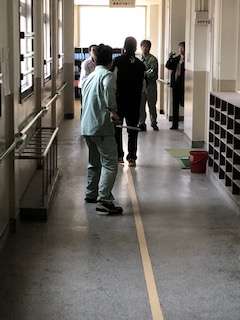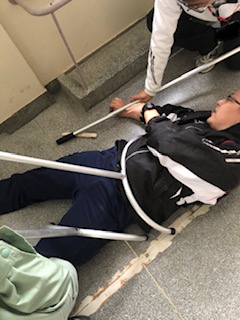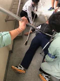 3時間目に刃物を持った不審者が校内に侵入したことを想定した防犯訓練を行いました。教職員が不審者を取り押さえる訓練をしています。