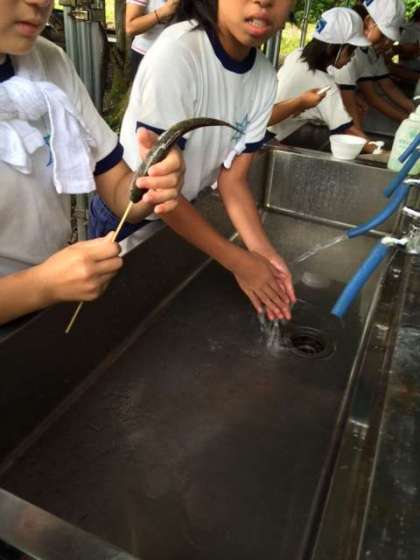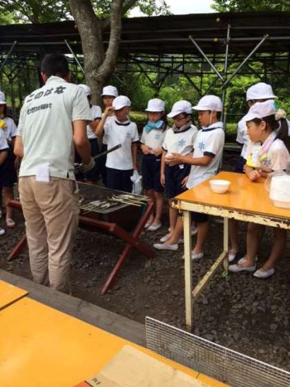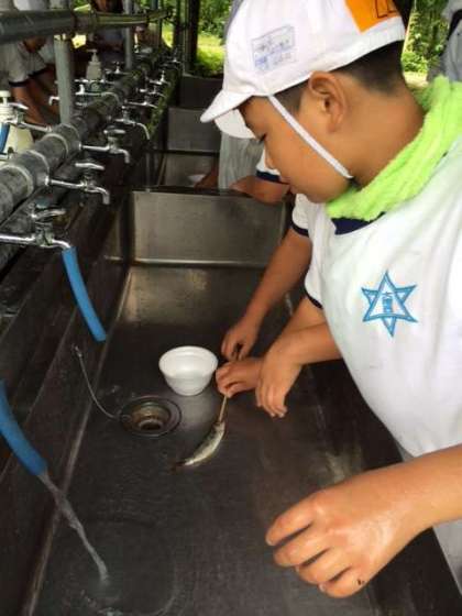 魚を串に刺しています。手際が・・・むずかしい?口の中に串を差し込む勇気が必要ですね。