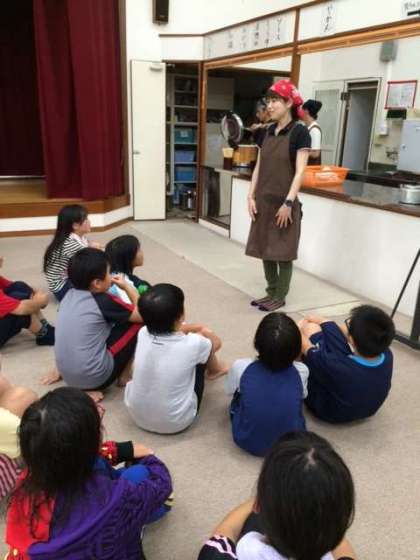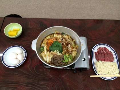 夕食の準備です。宿舎の人の話を聞いています。お!すきやきだぁ〜