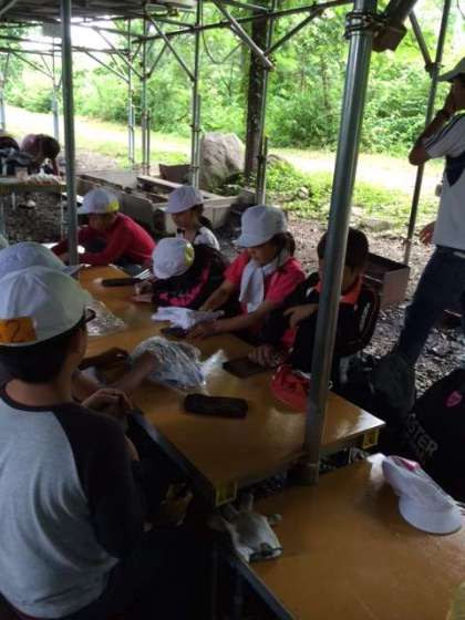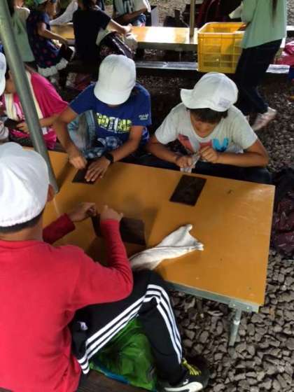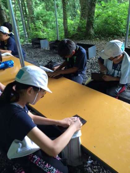 飯ごう炊さんでつくったカレーをおいしくいただいた後は、焼き板づくりです。昨日みがいておいた焼き板にペイントで絵や模様などをつけています。