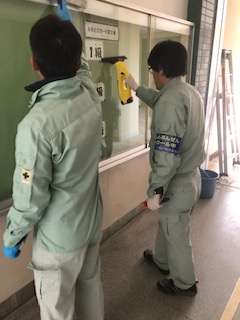 管理作業員が常に校内の美化を行なっています。今日は児童会などの連絡掲示板のガラスをきれいにしています。