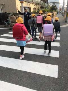 信号のない横断歩道に警察官の方が立っておられます。子どもたちもあいさつをしています。