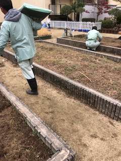 管理作業員が朝の登校の安全確保や花壇や植木鉢の土作りなどの業務を行なっています。
