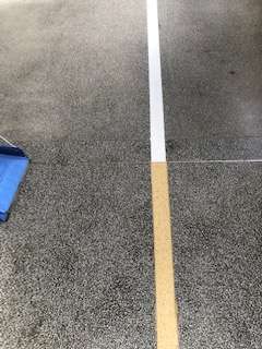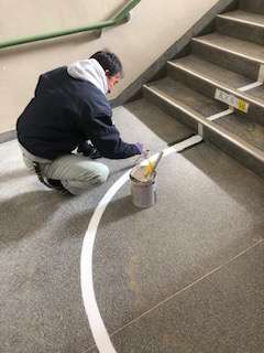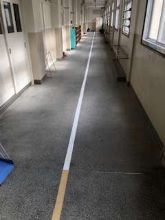 昨日の廊下の中央ラインははっきりと見えるようになりました。今日は階段の線を引いています。