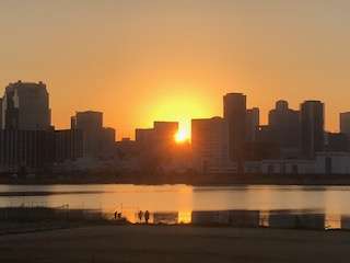 晴天の元旦となりました。初日の出が淀川の水面に映えています。