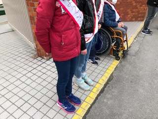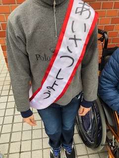 あいさつ週間が始まりました。たすきをかけて元気なあいさつをしています。