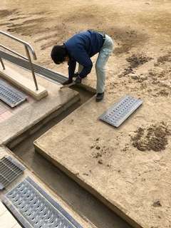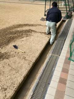 管理作業員が運動場の側溝の中の土砂を取り除く作業をしています。