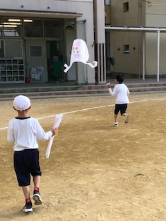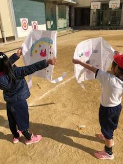 いろいろな絵が描かれたたこをあげています。1年生が大喜びで楽しんでいます。